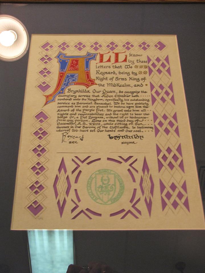 scroll12 Full size 720 × 960 pixels Cleftlands Scribal Display Award of the Purple Fret for Aiden Elfäedur Previous image Next image